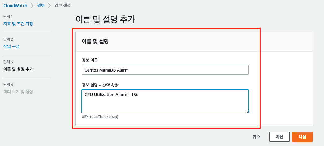4. [경보 생성] 3단계 - 이름 및 설명 추가