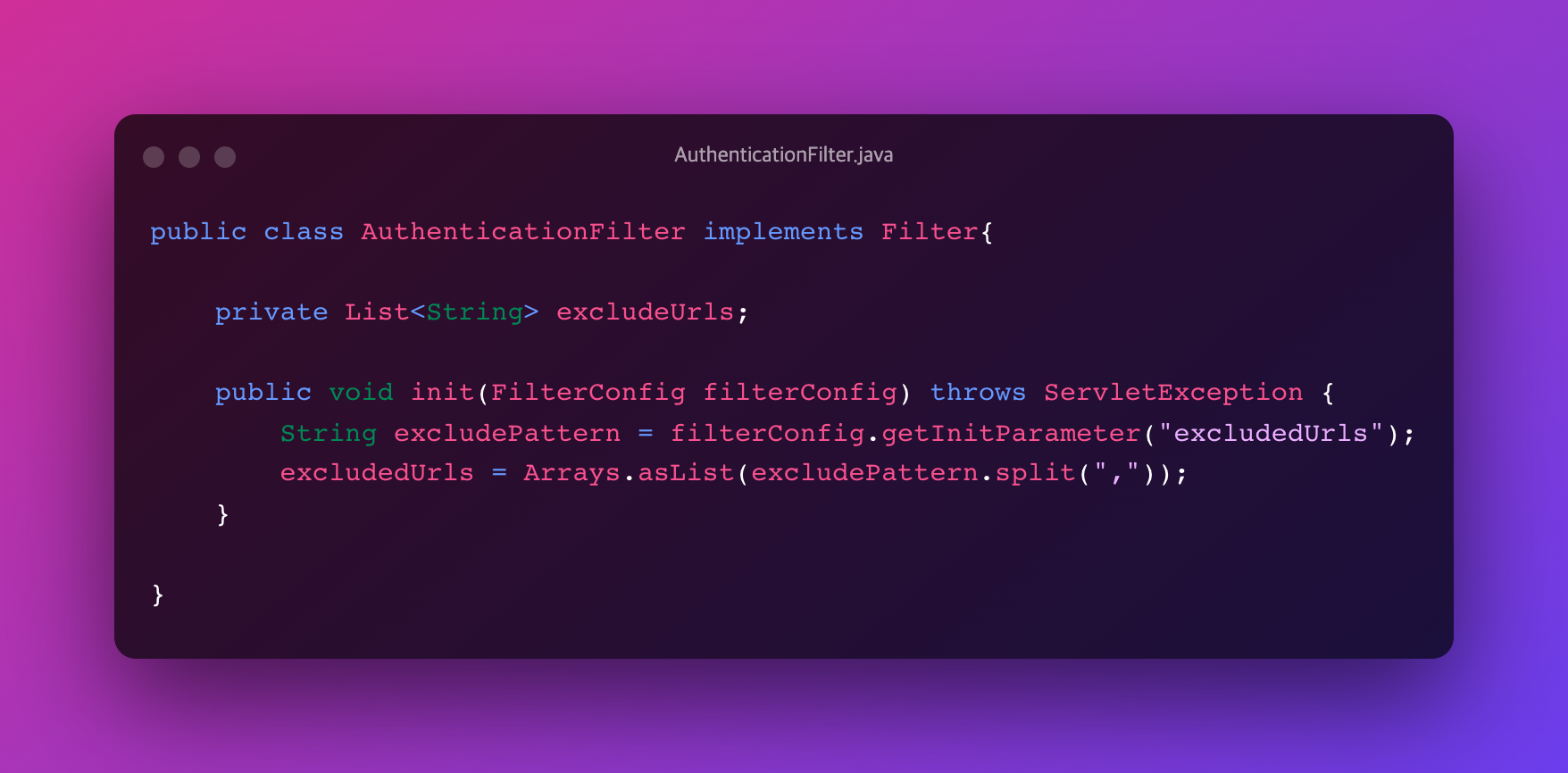 FilterConfig를 사용해서 ',' (콤마) 로 구별한 URL를 가져오고 리스트에 넣어줍니다.