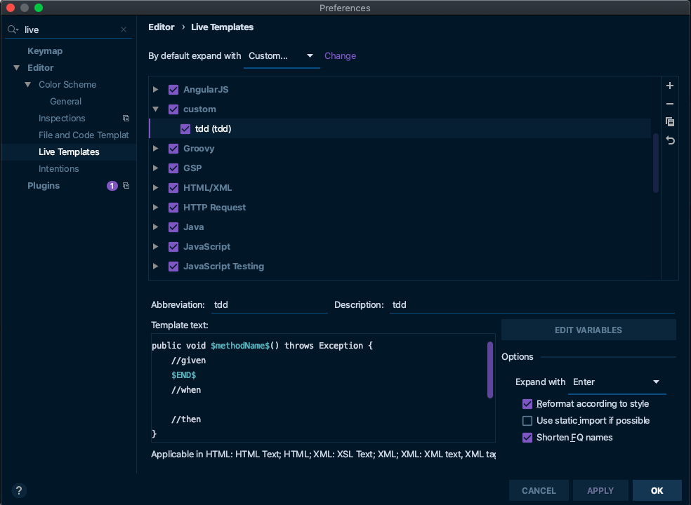 IntelliJ > Perference >Live Template에 추가를 할겁니다.