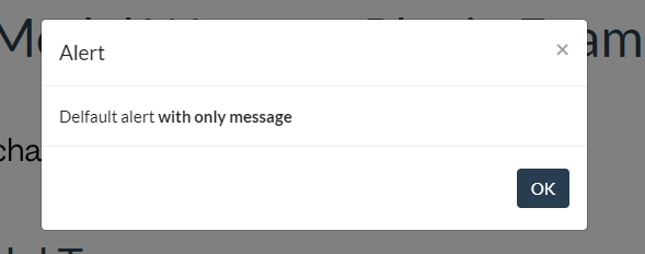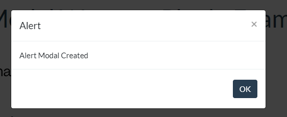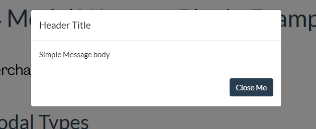 $("#onlyBodyWithHeader").on("click", function (event) { var modalWrapper = BootstrapModalWrapperFactory.createModal({ message: "Simple Message body", title: "Header Title", closable: true, closeByBackdrop: true }); modalWrapper.show(); }); Colored by Color Scripter |