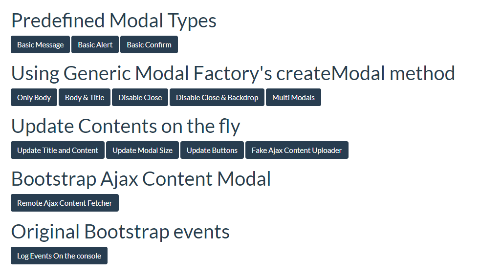 <button id="simple-message" type="button" class="btn btn-primary"> Basic Message </button> <button id="simple-alert" type="button" class="btn btn-primary"> Basic Alert </button> <button id="simple-confirm" type="button" class="btn btn-primary"> Basic Confirm </button> <h2 class="mt-3 text-primary">Using Generic Modal Factory's createModal method</h2> <button id="onlyBody" type="button" class="btn btn-primary"> Only Body </button> <button id="onlyBodyWithHeader" type="button" class="btn btn-primary"> Body & Title </button> <button id="disableClose" type="button" class="btn btn-primary"> Disable Close </button> <button id="disableCloseBackdrop" type="button" class="btn btn-primary"> Disable Close & Backdrop </button> <button id="multiModal" type="button" class="btn btn-primary"> Multi Modals </button> <h2 class="mt-3 text-primary">Update Contents on the fly</h2> <button id="updateTitleContent" type="button" class="btn btn-primary"> Update Title and Content </button> <button id="updateModalSize" type="button" class="btn btn-primary"> Update Modal Size </button> <button id="updateButtons" type="button" class="btn btn-primary"> Update Buttons </button> <button id="ajaxContent" type="button" class="btn btn-primary"> Fake Ajax Content Uploader </button> <h2 class="mt-3 text-primary">Bootstrap Ajax Content Modal</h2> <button id="ajaxContentModal" type="button" class="btn btn-primary"> Remote Ajax Content Fetcher </button> <h2 class="mt-3 text-primary">Original Bootstrap events</h2> <button id="logConsoleModal" type="button" class="btn btn-primary"> Log Events On the console </button> Colored by Color Scripter |