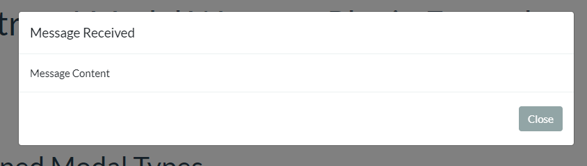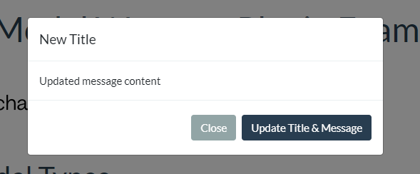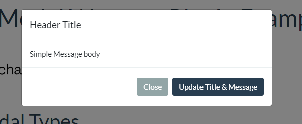 $("#updateTitleContent").on("click", function (event) { BootstrapModalWrapperFactory.createModal({ message: "Simple Message body", title: "Header Title", closable: false, closeByBackdrop: false, buttons: [ { label: "Close", cssClass: "btn btn-secondary", action: function (modalWrapper, button, buttonData, originalEvent) { return modalWrapper.hide(); } }, { label: "Update Title & Message", cssClass: "btn btn-primary", action: function (modalWrapper, button, buttonData, originalEvent) { modalWrapper.updateTitle("New Title"); modalWrapper.updateMessage("Updated message content"); } } ] }).show(); }); Colored by Color Scripter |