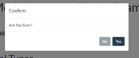 $("#simple-confirm").on("click", function (event) { BootstrapModalWrapperFactory.confirm({ title: "Confirm", message: "Are You Sure ?", onConfirmAccept: function () { BootstrapModalWrapperFactory.alert("Thank you for ACCEPTING the previous confiramtion dialog"); }, onConfirmCancel: function () { BootstrapModalWrapperFactory.alert("Thank you for CANCELING the previous confiramtion dialog"); } }); }); Colored by Color Scripter |