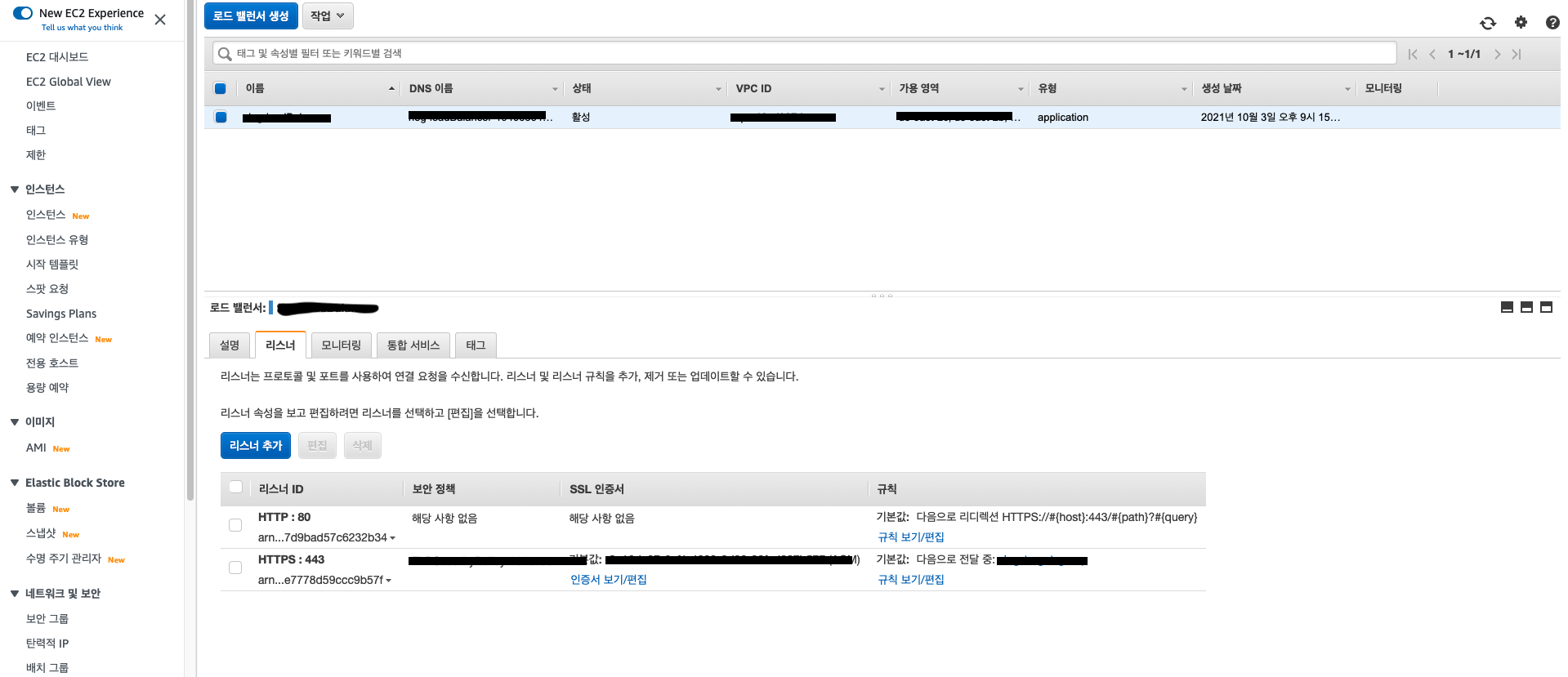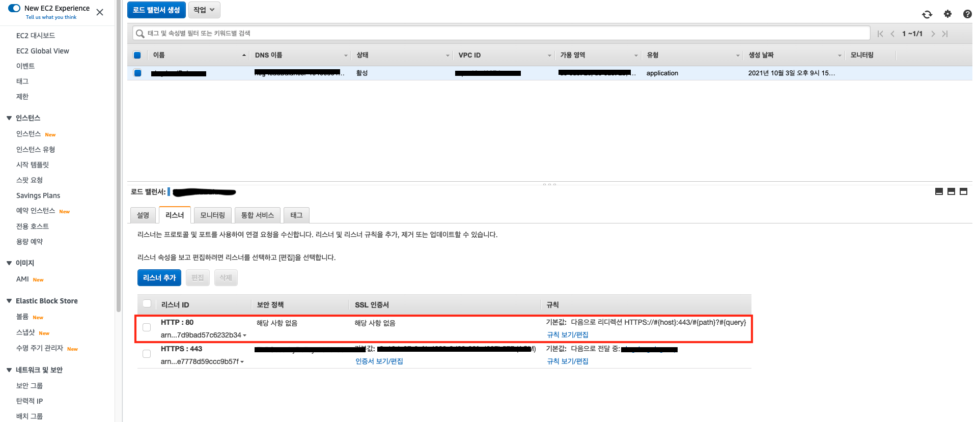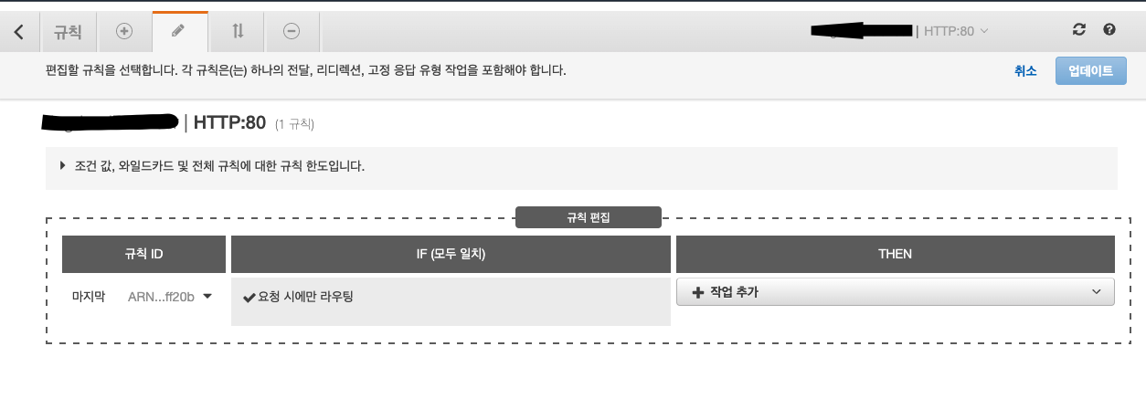 2. 로드밸런서에 HTTP 요청, 규칙을 추가/수정.