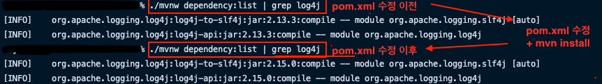 Log4j (v2.15.0) (v2.17.0)으로 강제 업데이트를 진행하였다.