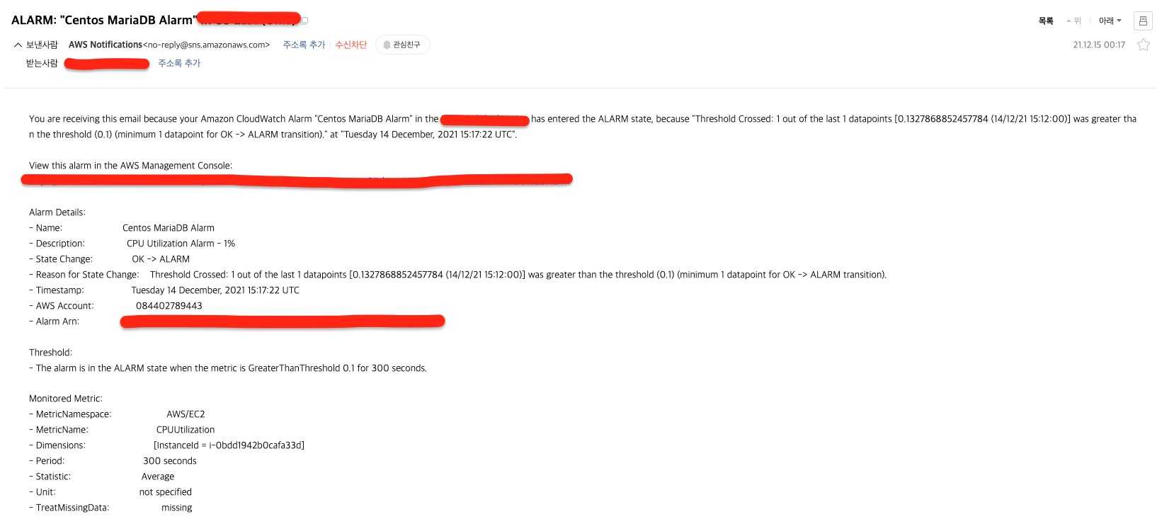 바로 AWS에서 경보 메일이 왔습니다. (성공!)