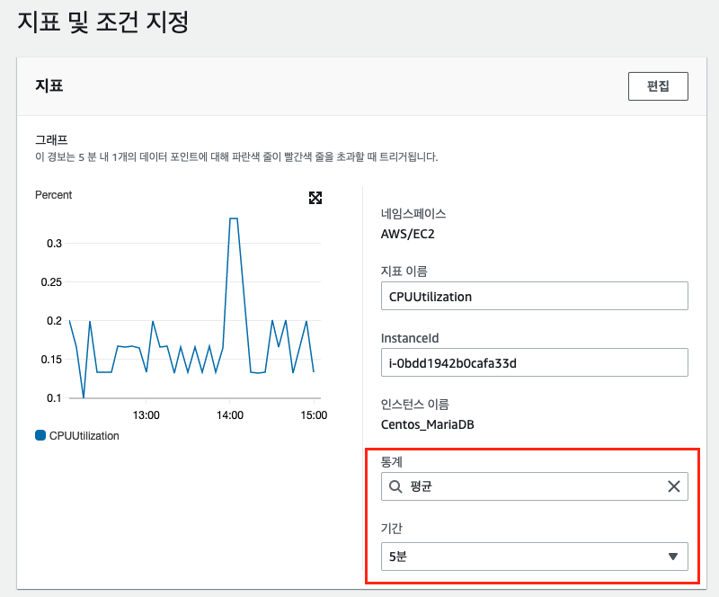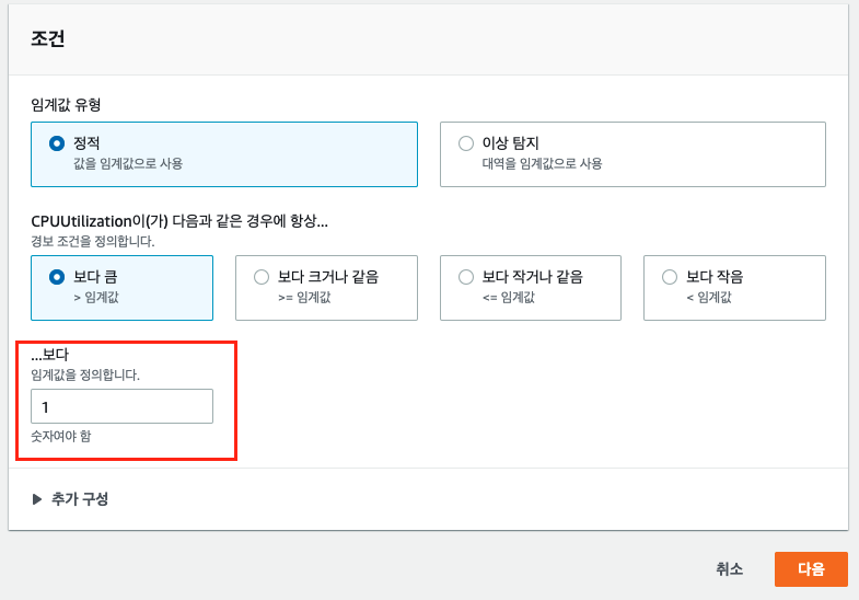 - AWS 인스턴스의 CPU 사용률에 한계치(Threshold) 를 설정하여, 경보 메일을 발신하게 합니다.