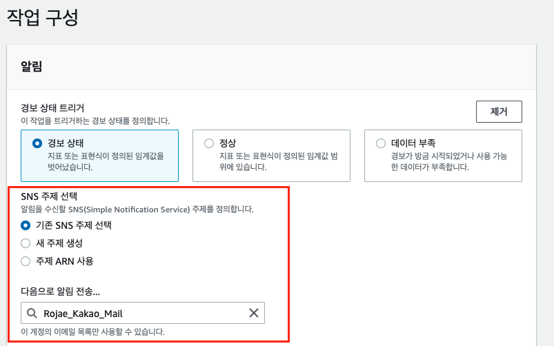 경보 알림을 받을, SNS를 선택합니다. (생성하지 않은 경우는, 새 주제 생성을 통해서 메일 인증 및 추가를 해야 합니다)