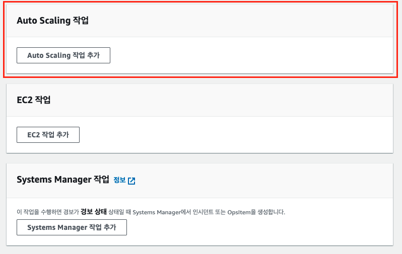 경보 발생 시, 수행할 인스턴스 작업(중지, 재시작, 정지)과 오토스켈링 (인스턴스 추가 등..)을 설정합니다.