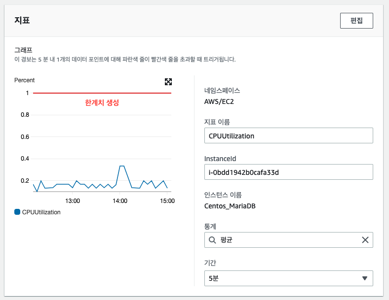 - AWS 인스턴스의 CPU 사용률에 한계치(Threshold) 를 설정하여, 경보 메일을 발신하게 합니다.