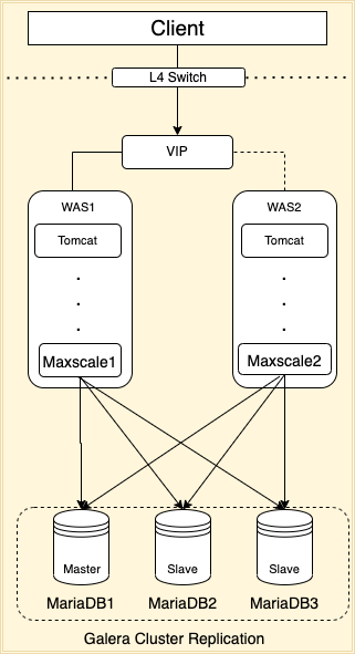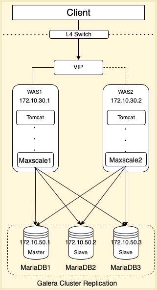 위처럼 보통 Maxscale 서버끼리 VIP 설정을 통해서, WAS 서버에서 접근을 한다.